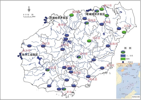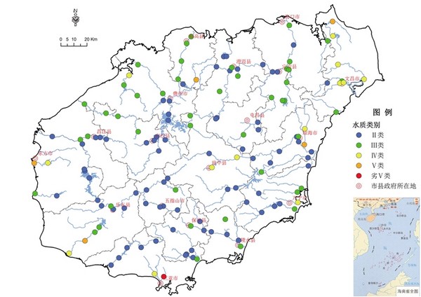 全省地表水环境质量总体良好。所监测的52条河流110个断面中,87.3%的监测断面水质符合或优于地表水Ⅲ类标准。其中,Ⅱ类水质占53.6%,Ⅲ类水质占33.7%,Ⅳ类水质占9.1%,Ⅴ类水质占2.7%,劣Ⅴ类水质占0.9%;Ⅳ类水质分布在营盘溪、塔洋河、文昌河、文教河、东山河、三亚河、望楼河、春江的局部河段,Ⅴ类水质分布在塔洋河下游河段、罗带河和珠溪河的入海河口,劣Ⅴ类水质分布在三亚河的城市河段。