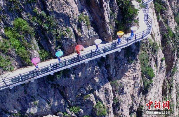8月28日,河南洛阳老君山悬崖栈道,几名女子身穿老君山“风景旗袍”在实景中走秀。中新社记者 王中举 摄