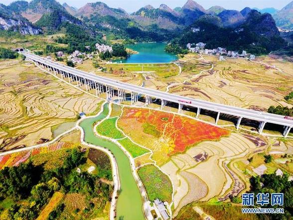 这是10月6日拍摄的广西河池市南丹县巴平村梯田。金秋时节,广西河池市南丹县巴平村梯田遍地金黄,五色鲜花点缀其间,美不胜收。新华社发(高东风 摄)