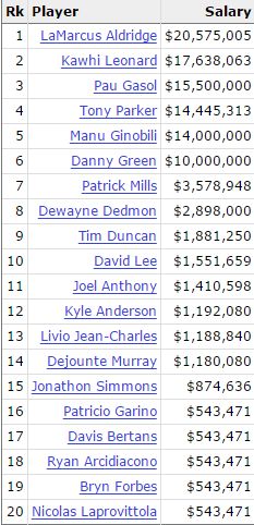 流出:蒂姆-邓肯(退役)、鲍里斯-迪奥(爵士)、博班-马里杨诺维奇(活塞)、大卫-韦斯特(勇士)、凯文-马丁(自由球员)、安德烈-米勒(自由球员)