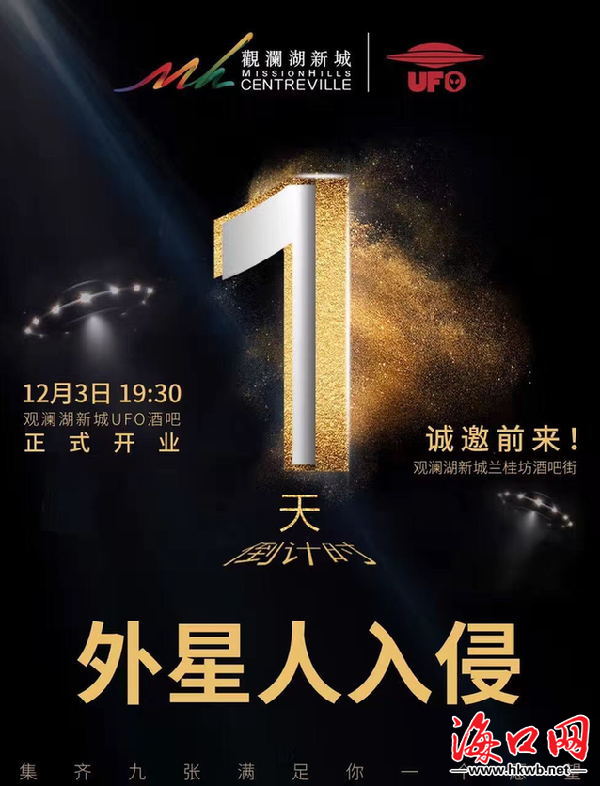 12月3日,海南首家户外街区式主题酒吧UFO将在观澜湖新城酒吧街正式开业,营业时间为每周五、六19:30—无限晚。该酒吧以UFO、ET等元素为全场装饰品,更有来自“外星球”的工作人员提供服务,此外,每周都有不同主题派对和最in乐队在此驻唱。