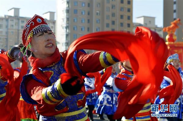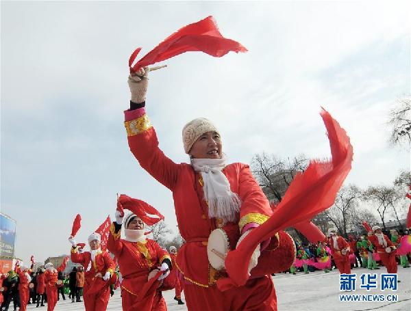 2月11日,市民在黑龙江省牡丹江市北山广场表演腰鼓。当日,牡丹江市爱民、东安等五城区的市民在北山广场举行民俗汇演,欢庆元宵佳节。新华社发(张春祥 摄)