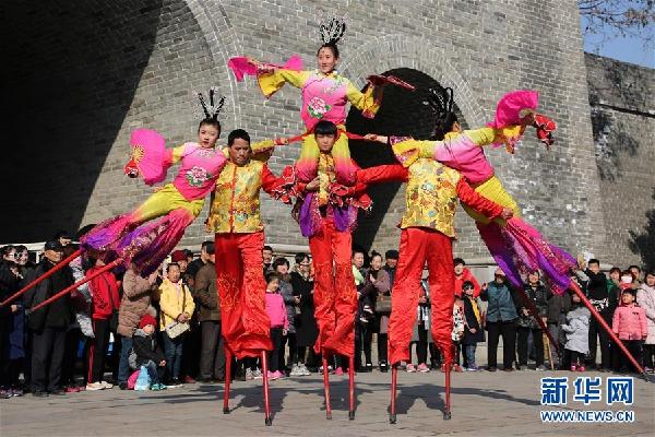 2月11日,民间艺人在枣庄市台儿庄古城进行踩高跷表演。当日,山东枣庄市台儿庄古城举行传统民俗特色的活动,欢庆元宵佳节。新华社发(孙中喆 摄)