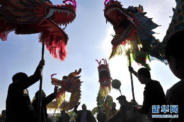 2月11日,河南沁阳王曲乡北山村的民间艺人在沁阳市朱载堉文化艺术中心广场上表演“龙灯舞”,欢庆元宵佳节。 新华社发(杨帆摄)