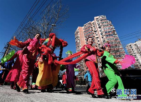 2月11日,社区居民在北京石景山区苹四区民俗元宵花会上表演踩街,欢庆元宵佳节。新华社发(李文明 摄)