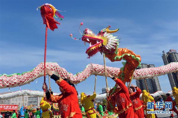 2月11日,河南沁阳王曲乡北山村的民间艺人在沁阳市朱载堉文化艺术中心广场上表演“龙灯舞”,欢庆元宵佳节。 新华社发(杨帆摄)