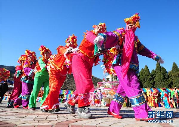 2月11日,民间艺人在山东省烟台塔山旅游风景区表演《金鸡起舞》。当日,山东省烟台市民间文艺团体在各大景区进行民俗展演,欢庆元宵节。新华社发(初阳 摄)