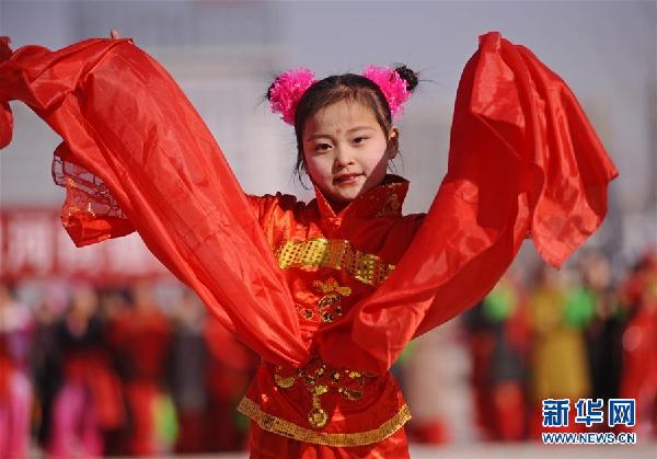 2月11日,一位小演员在山东省胶州市市民广场表演胶州秧歌。当日,山东省胶州市在市民广场举行2017年新春秧歌会,欢庆元宵节。新华社发(王昭脉摄)