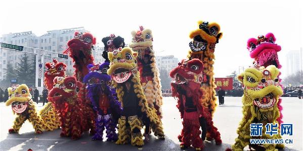 2月11日,山东省邹平县魏桥镇农民文艺队在表演耍狮子。当日,山东省邹平县举行庆元宵传统民俗文艺汇演暨农民文化艺术节活动。新华社发(董乃德 摄)