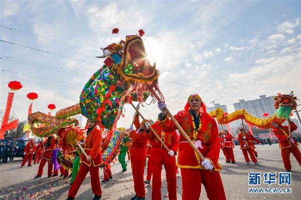 2月11日,演员在山西省洪洞县春节民间文艺展上舞龙。当日,山西省洪洞县举办春节民间文艺展,用传统民俗文化表演欢庆元宵佳节。新华社发(王培基 摄)