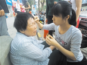 海口网3月21日消息(记者李传华 摄影报道)一位八旬老人因高血压昏倒在地磕破头,一位20岁的女孩看到后毫不犹豫地上前扶起,还主动帮助老人涂药止血,直到老人的孩子赶到将其接走,女孩才放心离开,围观群众无不称赞,“女孩长得美,心更美”。这是20日上午,发生在龙华区海垦路汇鑫市场旁的感人一幕。