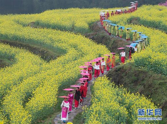 当日,龙泉市李山头村的梯田油菜花海中迎来了浙江温州、丽水等地的约五百名旗袍爱好者。爱好者在花田之中漫步,展示旗袍风采。新华社发(李肃人 摄)