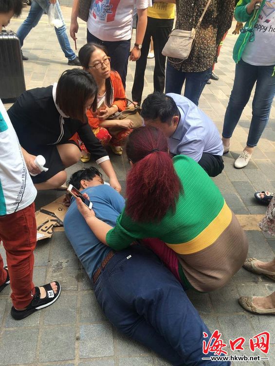 海口网3月25日消息(记者钟元韬)25日11时许,海口市民杨先生在骑楼老街游玩时突发疾病昏倒在地,四肢抽搐,牙关紧锁,嘴巴还不停冒出鲜血。据了解,当时杨先生舌头后坠导致窒息,如不立刻施救会有生命危险。就在情况最危急的时刻,海口市人民医院的骨科医生孔长庚和肿瘤科护士廖燕夫妇俩及时上前施救,才让杨先生转危为安。