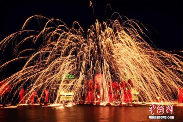 3月26日夜晚,国家非物质文化遗产“巨村舞龙”在江苏茅山脚下的东方盐湖城上演铁火龙腾的壮观场景。当晚,“龙腾茅山耀庆周年”东方盐湖城周年庆演出拉开序幕,为游客献上一场华美的视觉盛宴。东方盐湖城这座以道文化为主题的江南山镇,在夜色中化作天然舞台,茅山民俗特色的歌、舞、杂技与山镇焰火将庆典的气氛推向高潮。值得一提的是,国家非物质文化遗产“巨村舞龙”再现山镇。巨村舞龙起源于金坛直溪镇,始于元末明初,以舞龙娱神娱人,以保风调雨顺,一方平安。夜晚,舞龙表演更是以“火龙”形式闪亮登场。用蘸了水的木板对准抛在空中落下的铁水,用力将其打散,顿时铁水飞散,化作一簇簇耀眼的“火花”在空中绽放。舞龙者手中的火龙在“铁水流星”下转腾挪动的壮观场景,让在场的游客大呼过瘾。东方盐湖城景区于2016年3月26日开城,开园一年,接待入园游客超百万人次,获得了“2016中国年度最佳休闲小镇”等多项殊荣。图为“龙腾茅山耀庆周年”东方盐湖城周年庆演出拉开序幕,为游客献上一场华美的视觉盛宴。 马可云 摄