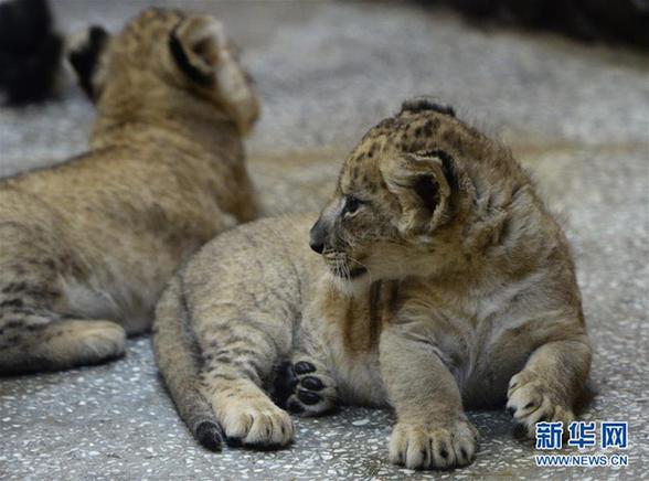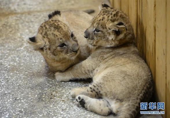 4月12日,在俄罗斯叶卡捷琳堡动物园,两只新出生的非洲狮幼崽在玩耍。新华社/卫星社