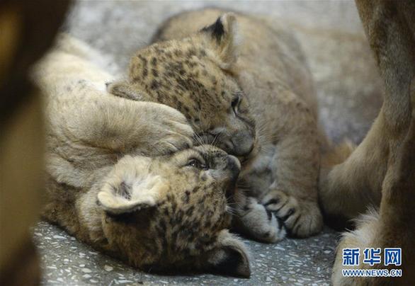 4月12日,在俄罗斯叶卡捷琳堡动物园,两只新出生的非洲狮幼崽在一起。新华社/卫星社