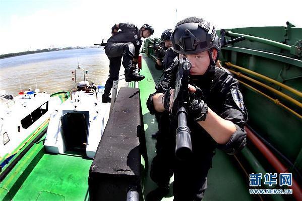 7月31日,特警队员们乘坐公安艇利用挂梯攀爬上“歹徒”藏身的船舶展开突击。