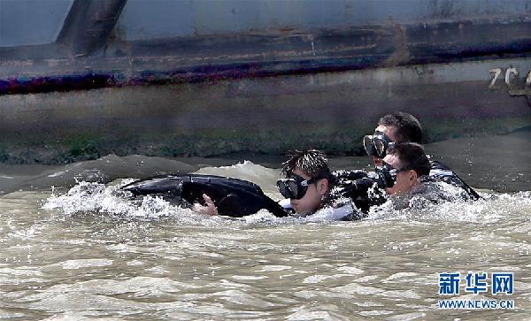 7月31日,特警队员利用水下推进器从黄浦江上靠近“歹徒”藏身的船舶准备进行突击。