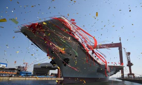 资料图:2017年4月26日,中国首艘国产航母船坞下水瞬间。