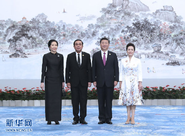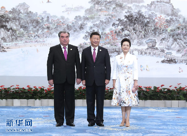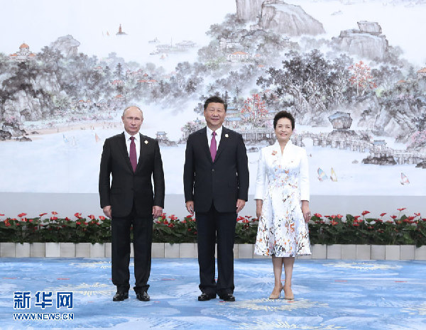 晚6时25分许,金砖国家和新兴市场国家与发展中国家对话会受邀国领导人及配偶相继抵达。习近平和彭丽媛同贵宾们一一握手,互致问候。习近平和彭丽媛同各国领导人及配偶在巨幅水墨画“世界文化遗产鼓浪屿”前合影留念。