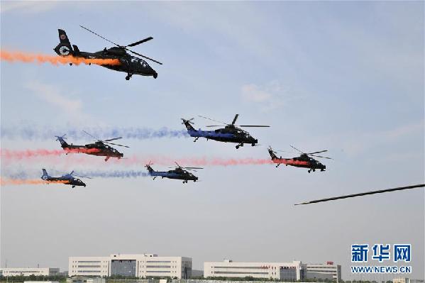 9月14日,陆军“风雷”飞行表演队武装直升机机群在开幕式上进行超低空大速度通场。当日,第四届中国天津国际直升机博览会在天津空港经济区开幕。开幕式上,陆军“风雷”飞行表演队为现场观众带来了一场精彩刺激的视觉盛宴。新华社记者张永进摄