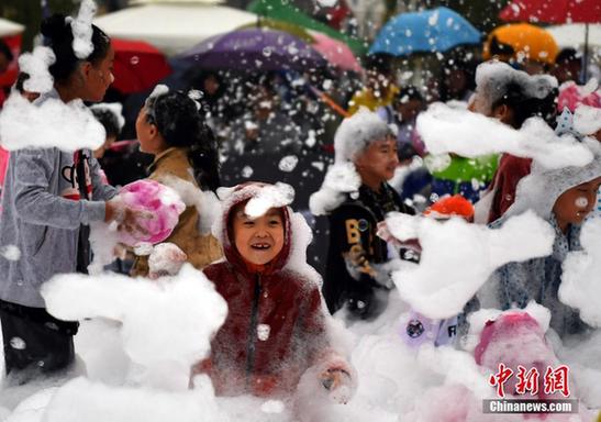 10月7日,国庆临近收尾,当地下起大雨。河北石家庄一“泡泡池”吸引了很多孩童,他们在雨中开心的度过即将结束的国庆长假。 中新社记者翟羽佳 摄