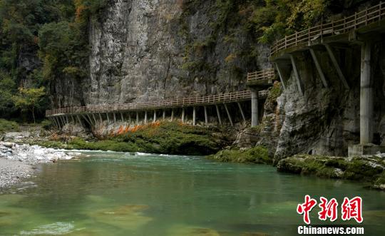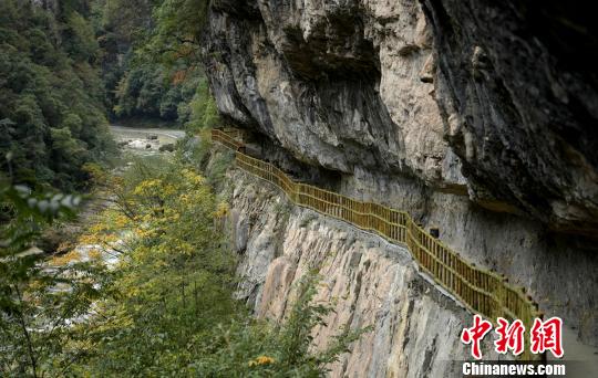 中新网南江10月25日电(岳依桐魏尧)贴着几乎垂直的山壁,一条窄小的古道蜿蜒向前,悬空一侧仅有矮小的护栏作为遮挡,一眼望下去只让人觉得头晕目眩……25日,记者探访了位于四川省巴中市南江县境内的米仓山古栈道,真切感受了“蜀道难,难于上青天”。