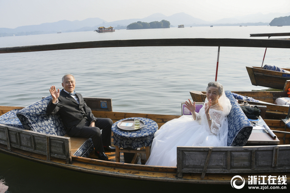 10月25日,12对金婚老人着礼服、婚纱畅游杭州西湖,引来游客声声祝福。