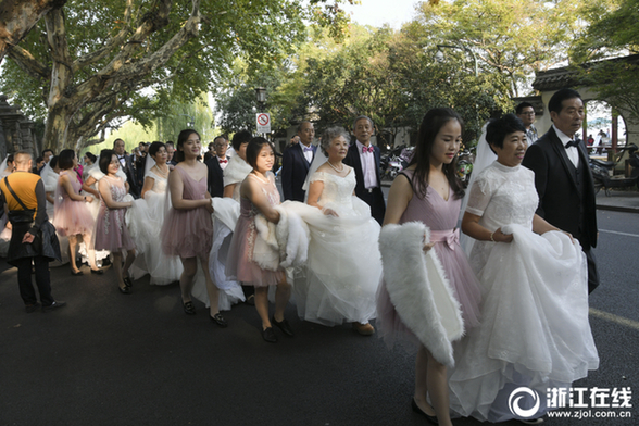 10月25日,12对金婚老人着礼服、婚纱畅游杭州西湖,引来游客声声祝福。当日,一场浪漫的金婚party在西湖湖畔上演,在“求婚”仪式上,老人们有的单膝下跪,有的相拥而吻,用温暖与质朴诠释各自的爱情秘诀。(浙江在线记者杨晓轩 于诗奇 李翔 摄)