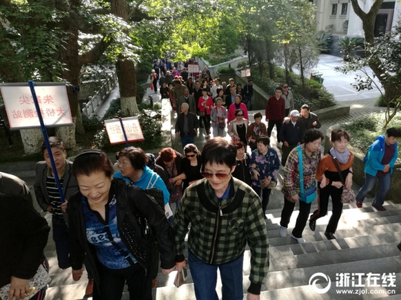 10月25日上午,舟山市定海区海山公园人头攒动,来自舟山市直属单位的近万名老人沿着蜿蜒山道健步而上,感受集体登山迎重阳节的乐趣。(浙江在线拍友胡社友 摄)