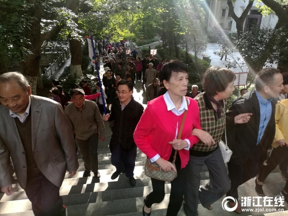 10月25日上午,舟山市定海区海山公园人头攒动,来自舟山市直属单位的近万名老人沿着蜿蜒山道健步而上,感受集体登山迎重阳节的乐趣。(浙江在线拍友胡社友 摄)