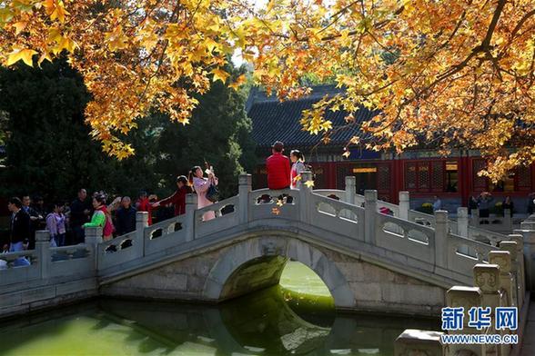 10月30日,游人在北京香山公园内游览拍照。深秋时节,北京部分街道和景区秋色尽染,吸引众多游人。 新华社发(王希宝摄)