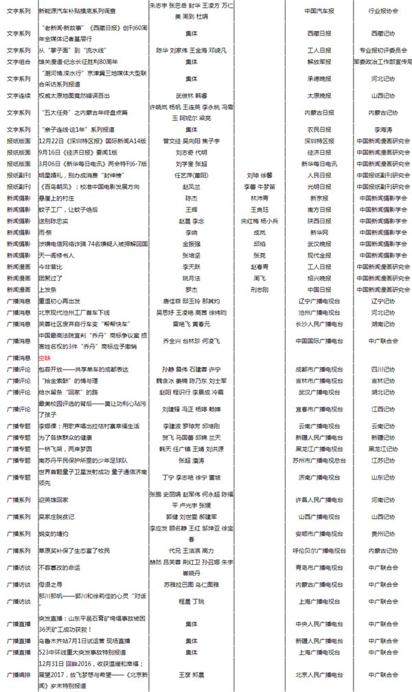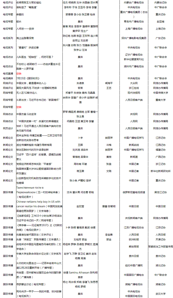 获一等奖的中央电视台纪录片《永远在路上》采访扎实,首次公开讲述多位原省部级以上违法违纪官员的忏悔和反思,彰显十八大以来,党中央全面推进从严治党,刮骨疗毒、正风肃纪的勇气和决心。山西日报文字通讯《别了,白家庄矿》通过小切口反映大事件,小人物折射大时代,反映推动供给侧结构性改革的大主题。中央人民广播电台广播消息《速度与激情:“中国标准”动车组成功通过时速420公里高速交会试验》等作品采访全面深入、报道生动鲜活,展现了主流媒体对中国改革发展进程的深入观察思考。获新闻名专栏的浙江日报《之江观察》、红网《问政湖南》等栏目紧扣社会热点,创新报道语言,立足小切口,讲好大故事,体现了媒体敢于发声、引领舆论的责任担当,展现了良好的品牌影响力和传播力。