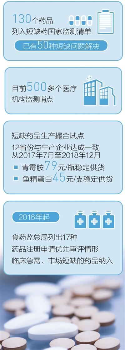 让“一药不再难求”,我国正在通过完善监测预警、优化药品研发流程、加强供需协调等全链条发力。从2016年起,食药监总局对药品注册申请优先审评列出了17种情形,将临床急需、市场短缺的药品纳入优先审评范围。今年6月,国家卫生计生委有关负责人表示,社会关注度较高的鱼精蛋白、丝裂霉素等130个临床急需短缺用药均已列入清单管理;短缺药品市场撮合试点开展,国家短缺药品供应保障工作会商联动机制启动,一揽子解决了监测清单中大部分药品短缺问题。从今年11月22日起,针对氨苯砜等短缺药品清单上27种疑难短缺用药,多部门将集中原料药和制剂生产企业会商解决。此外,今后我国将扩大监测范围,在目前500多个医疗机构监测哨点基础上,向生产和流通等重点环节延伸,推动实现信息监测全覆盖。