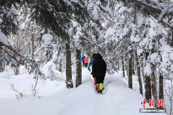 12月7日,游客走进凤凰山国家森林公园,站在高山之巅,极目远眺,白雪共长天一色,群山与旭日同辉。凤凰山国家森林公园坐落在黑龙江省东南部,山河屯重点国有林管理局。凤凰山国家森林公园,是一江两河之源,山川雄峙,峡谷险峻,主峰海拔1696米,有“龙江第一峰”之誉,是集国家森林公园、国家地质公园和国家级自然保护区于一身的AAAA级旅游景区。图为游客穿越林海雪原。中新社记者于琨 摄