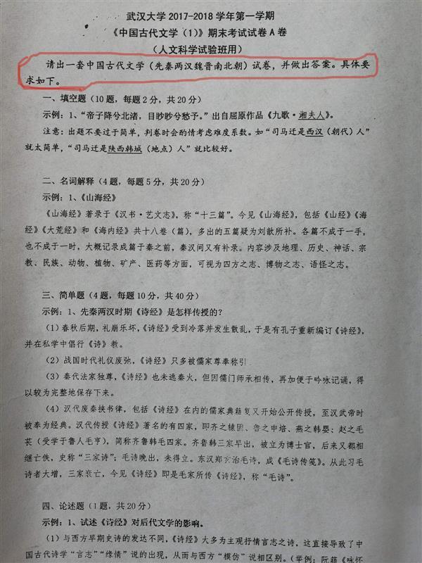 据楚天都市报1月12日消息,12日下午,武汉大学2017级人文科学实验班的学生们迎来《中国古代文学》课的期末考试,在看到下发的“试卷”的那一刻,学生们却发生了骚动——敢情这写得满满的一张纸不是试卷,只是出卷说明,另一张白纸才是真正的试卷,至于题目么,请现场自己出。