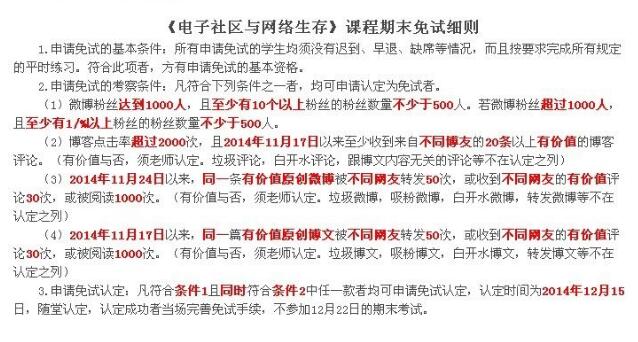 “微博粉丝达到1000人,且至少有10个以上粉丝的粉丝数量不少于500人”、“原创微博被不同网友转发50次,或收到不同网友的有价值评论30次,或被阅读1000次”……这是2015年四川外国语大学新闻传播学院的“电子社区与网络生存”课期末免试细则。