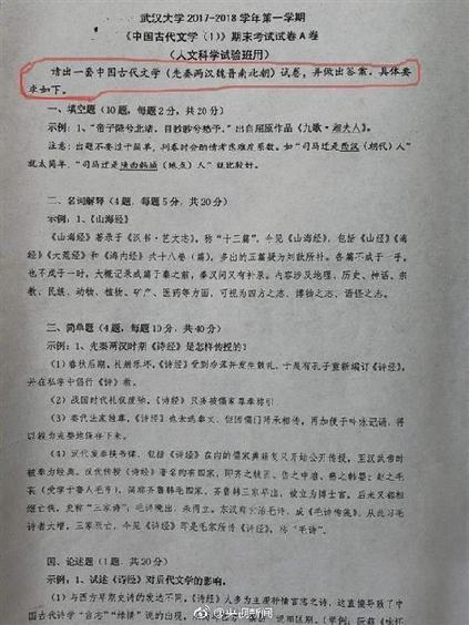 出考题在各式各样的期末考中已经算是传统模式了,武汉大学“中国古代文学”课的老师直接要求学生“自己出题考自己”,根据题目的难度酌情打分。这脑洞开的,请收下我们的膝盖!