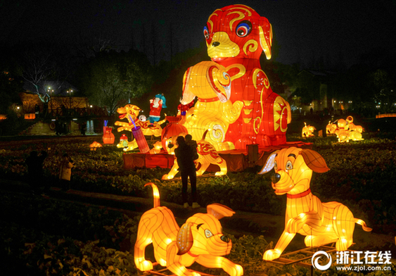 狗年春节将至,百只造型各异的福犬花灯亮相乌镇西栅。