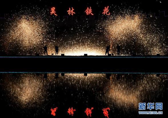 春节期间,河北磁县举行“打铁花”表演。“打铁花”是小炼铁炉将生铁化成铁水后,用木板将铁水加锯末打上天空,在空中形成“铁花火雨”的景象。
