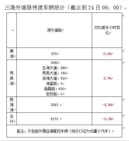 三港外道路约有5180辆车辆待渡,其中秀英港2227辆,新海港2343辆,南港610辆),港内约有4109辆车辆待渡,其中,秀英港1748辆(其中大车49辆),新海港2001辆(其中大车118辆),南港360辆(其中大车8辆),共计9289辆,对比前半小时增加3.8%。