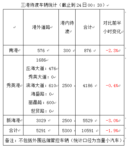 【0:35】截至24日0时30分 海口三港共计10591辆车待渡