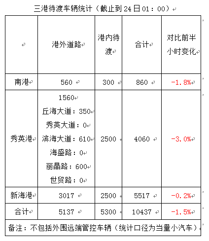 【1:05】截至24日1时 海口三港共计10437辆车待渡