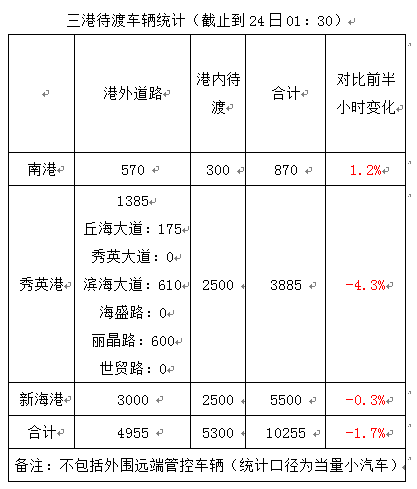 【1:31】截至24日1时30分 海口三港共计10255辆车待渡