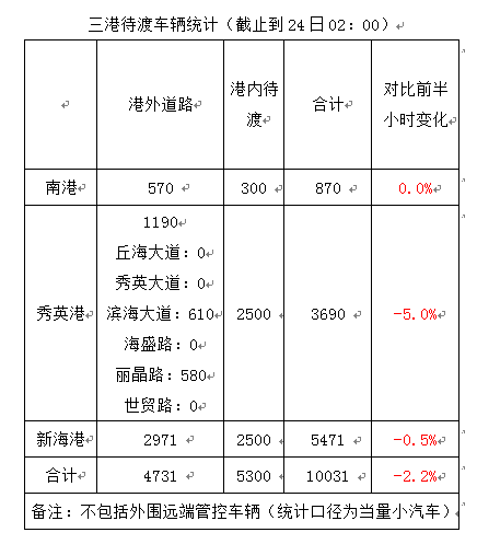 【2:14】截至24日2时 海口三港共计10031辆车待渡