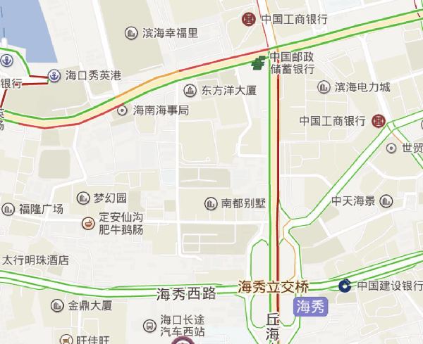 丘滨路口南往北尾部排过海秀立交桥,北往南尾部排至港爱路口;