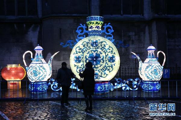 3月9日,在比利时迪南,游客们欣赏来自中国的彩灯。作为中欧“光之桥”活动的一部分,大型自贡彩灯展9日晚在比利时瓦隆大区旅游名城迪南拉开帷幕。新华社记者王晓郡摄