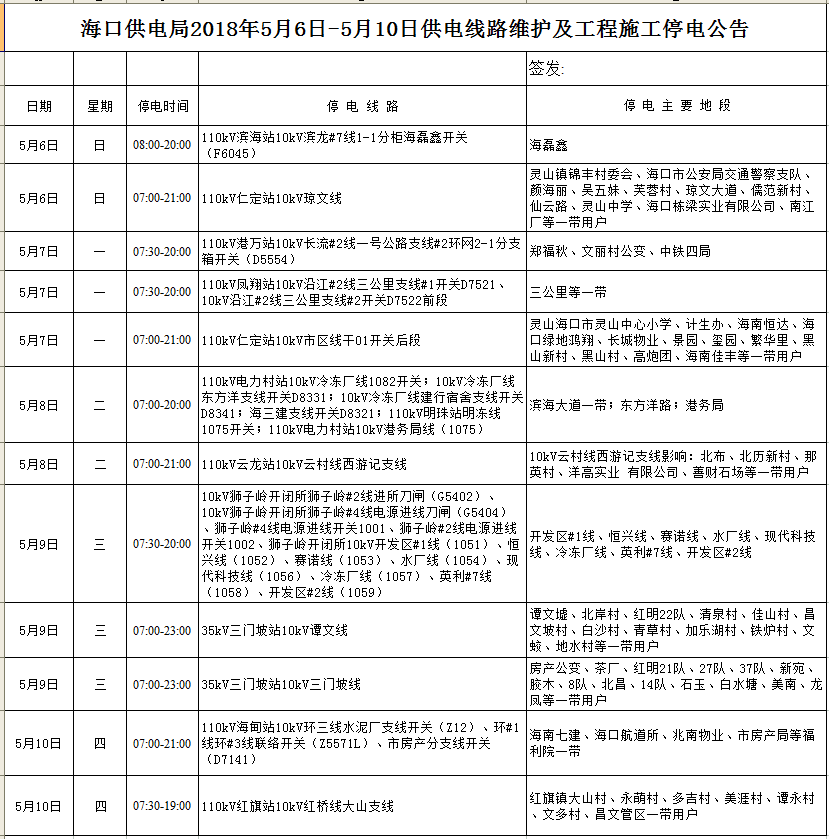 4月28日,海口供电局发布2018年5月6日-5月10日海口供电线路维护及工程施工停电线路、时间和主要地段等情况,提醒市民做好相关准备,避免停电对生活造成不便。