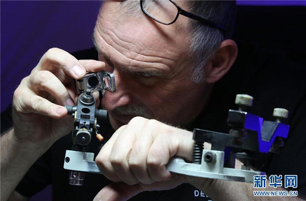 5月4日,在比利时安特卫普钻石博物馆,一名工匠现场演示钻石加工。新华社记者王晓郡 摄