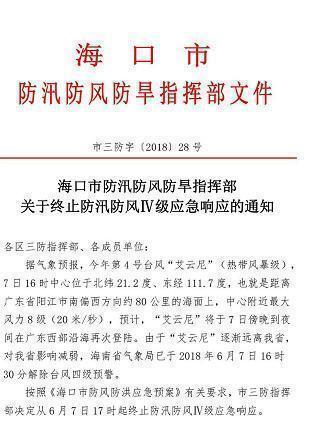 海口网6月7日消息(记者陈家煜)由于“艾云尼”逐渐远离海南,对本省影响减弱,海南省气象局已于7日16时30分解除台风四级预警。按照《海口市防风防洪应急预案》有关要求,海口市三防指挥部决定从6月7日17时起终止防汛防风Ⅳ级应急响应。